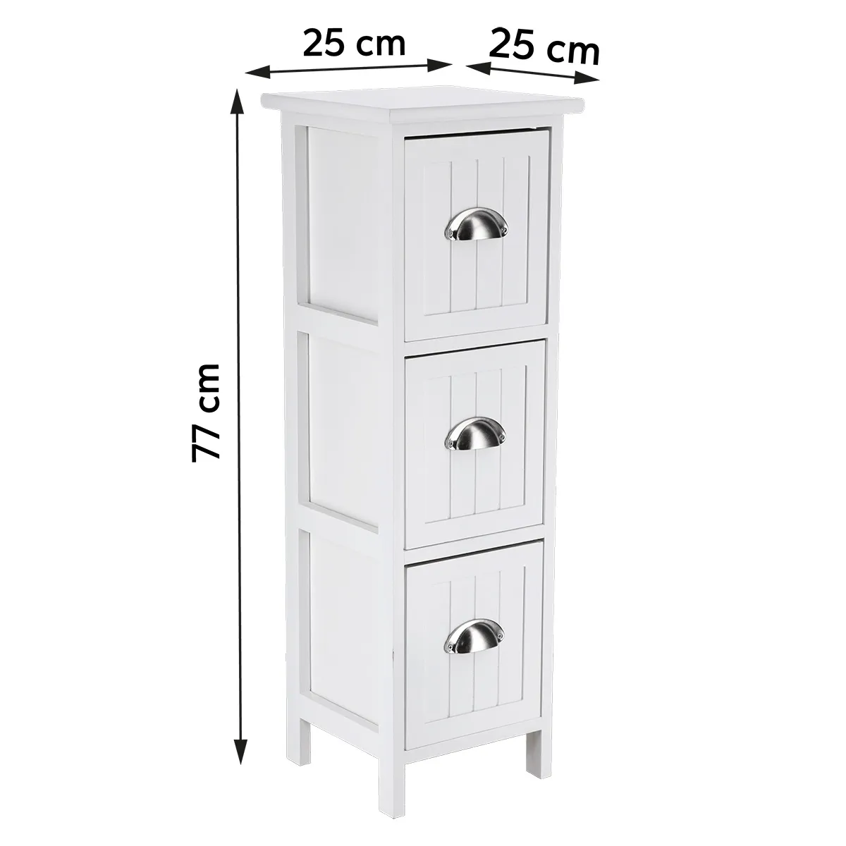 Corp mobilier MDF cu 3 sertare 77x25x25 cm – Alb | Mobilier depozitare baie. Corpul de mobilier pentru baie din MDF, cu 3 sertare, este soluția ideală pentru organizarea eficientă și elegantă a spațiului. Finisajul alb oferă un aspect curat și luminos, fiind ușor de integrat în băi moderne, clasice sau cu design minimalist. Cele trei sertare încăpătoare permit depozitarea ordonată a cosmeticelor, produselor de igienă, accesoriilor sau prosoapelor mici. Designul vertical și compact optimizează spațiul disponibil, fiind potrivit inclusiv pentru băi de dimensiuni reduse. Țara de origine: CN.