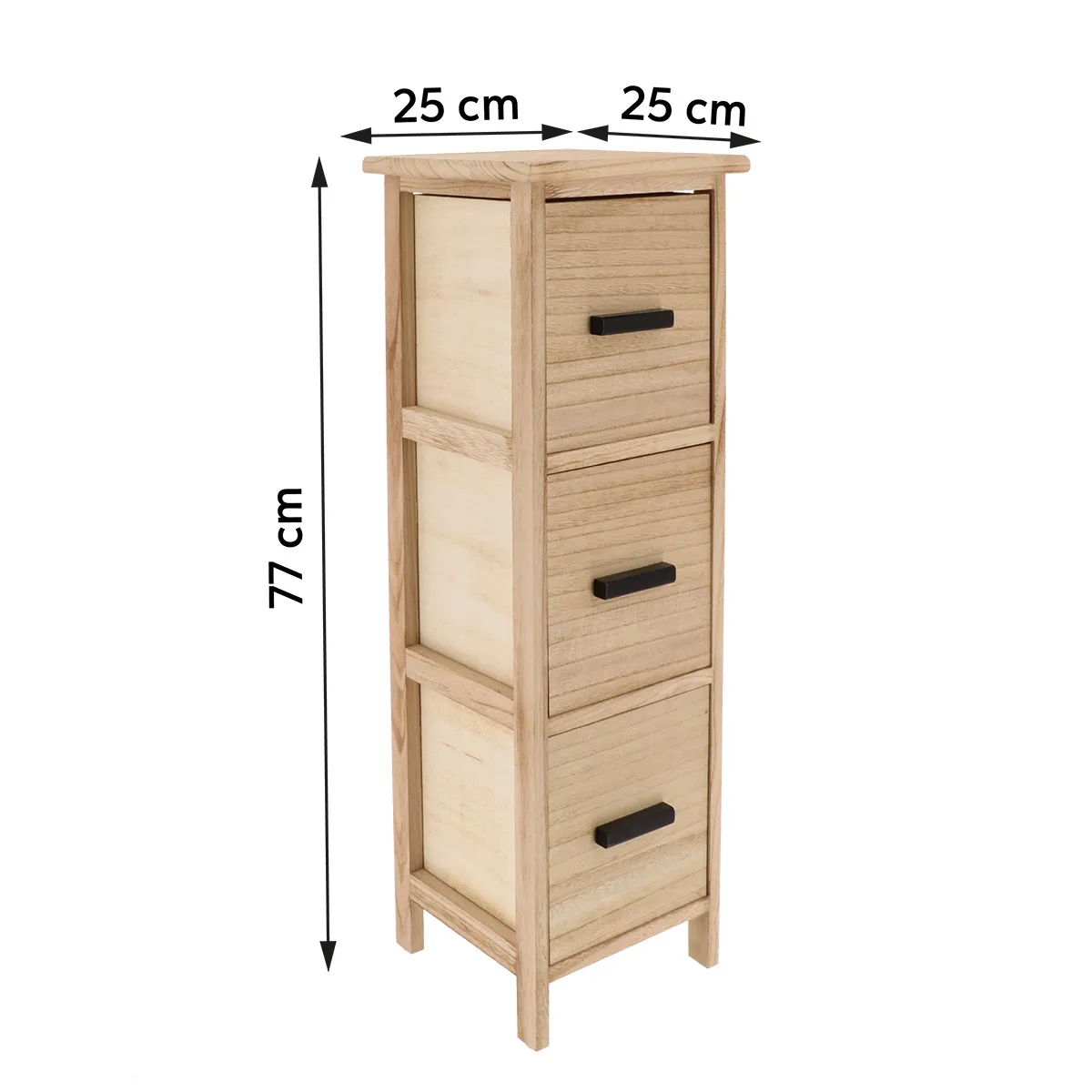Corp mobilier MDF cu 3 sertare 77x25x25 cm – Natural | Mobilier depozitare baie. Corpul de mobilier pentru baie din MDF, cu 3 sertare, este o soluție practică și elegantă pentru organizarea eficientă a spațiului sanitar. Finisajul natural, cu aspect de lemn, oferă un design cald și modern, ușor de integrat în băi scandinave, contemporane sau rustice. Cele 3 sertare spațioase, prevăzute cu mânere discrete, permit depozitarea organizată a produselor de igienă, cosmeticelor sau accesoriilor de baie. Structura verticală economisește spațiu și asigură stabilitate, fiind ideală pentru băi mici sau medii. Țara de origine : CN.