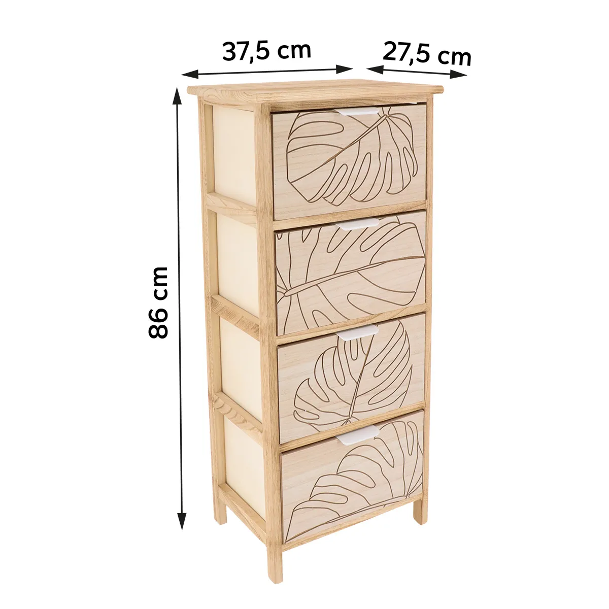 Corp mobilier MDF cu 4 coșuri gravate 86×37,5×27,5 cm – Alb/Natural | Mobilier depozitare baie. Corpul de mobilier pentru baie din MDF, prevăzut cu 4 coșuri gravate, este alegerea ideală pentru organizarea eficientă și elegantă a spațiului sanitar. Combinația de finisaj alb și natural, împreună cu modelele gravate cu motive vegetale, oferă un design luminos, armonios și relaxant, perfect pentru băi moderne, scandinave sau cu influențe naturale. Cele 4 coșuri spațioase asigură depozitarea ordonată a produselor de igienă, cosmeticelor sau accesoriilor de baie. Structura verticală economisește spațiu și oferă stabilitate, fiind potrivită atât pentru băi mici, cât și pentru alte încăperi din locuință. Țara de origine : CN.