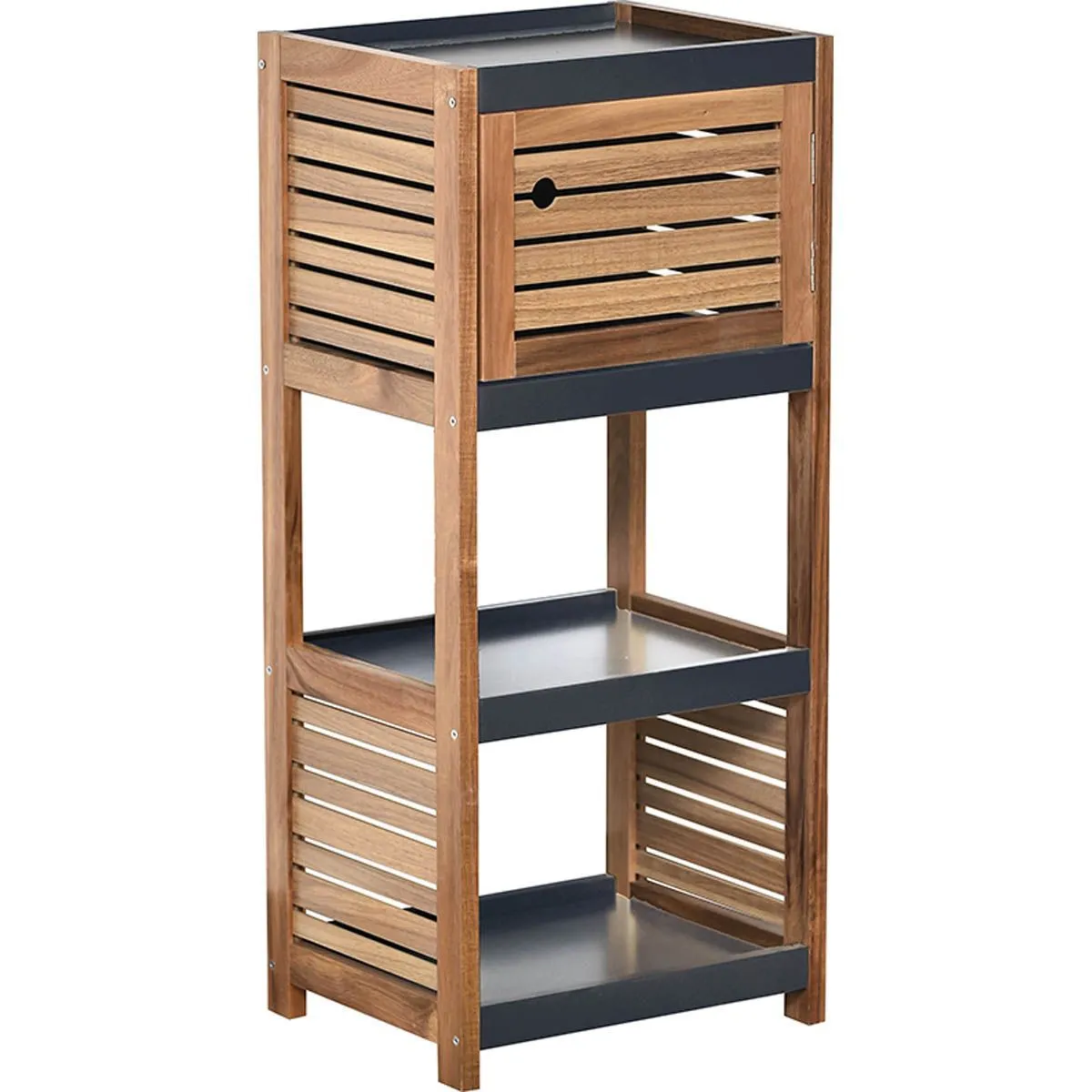 MOBILIER BAIE MDF/ACACIA 1 USA/2 RAFTURI – NEGRU / ACACIA | MOBILIER DEPOZITARE BAIE ESTE UN DULAP DE BAIE PENTRU DEPOZITAREA PROSOAPELOR, COSMETICELOR ȘI PRODUSELOR DE CURĂȚENIE. REALIZAT DIN MDF, ÎN FINISAJUL NEGRU, OFERĂ SPAȚIU GENEROS DE ORGANIZARE.