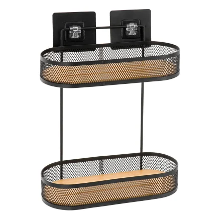 69,00 leiSUPORT COSMETICE OVAL 2 RAFTURI METAL/BAMBUS CU ADEZIV – NEGRU / BAMBOO | ETAJERE BAIE